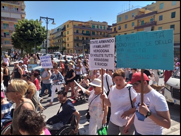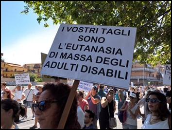 Una manifestazione molto partecipata quella che si è svolta lo scorso giovedì 27 giugno a Ladispoli per dire “no” ai tagli che l’Amministrazione comunale ha decretato per l’assistenza delle persone con disabilità. Il corteo a cui ha aderito la FISH Lazio insieme a numerose associazioni è stato promosso dal Forum Terzo Settore del Lazio, e si snodato da P.le Roma per terminare proprio davanti al Palazzo comunale della cittadina vicino Roma. 250.000 euro in meno. Questo l’ammontare dei tagli previsti per il settore sociale, che lascerà molte persone e famiglie senza servizi indispensabili a far fronte alle esigenze assistenziali quotidiane.